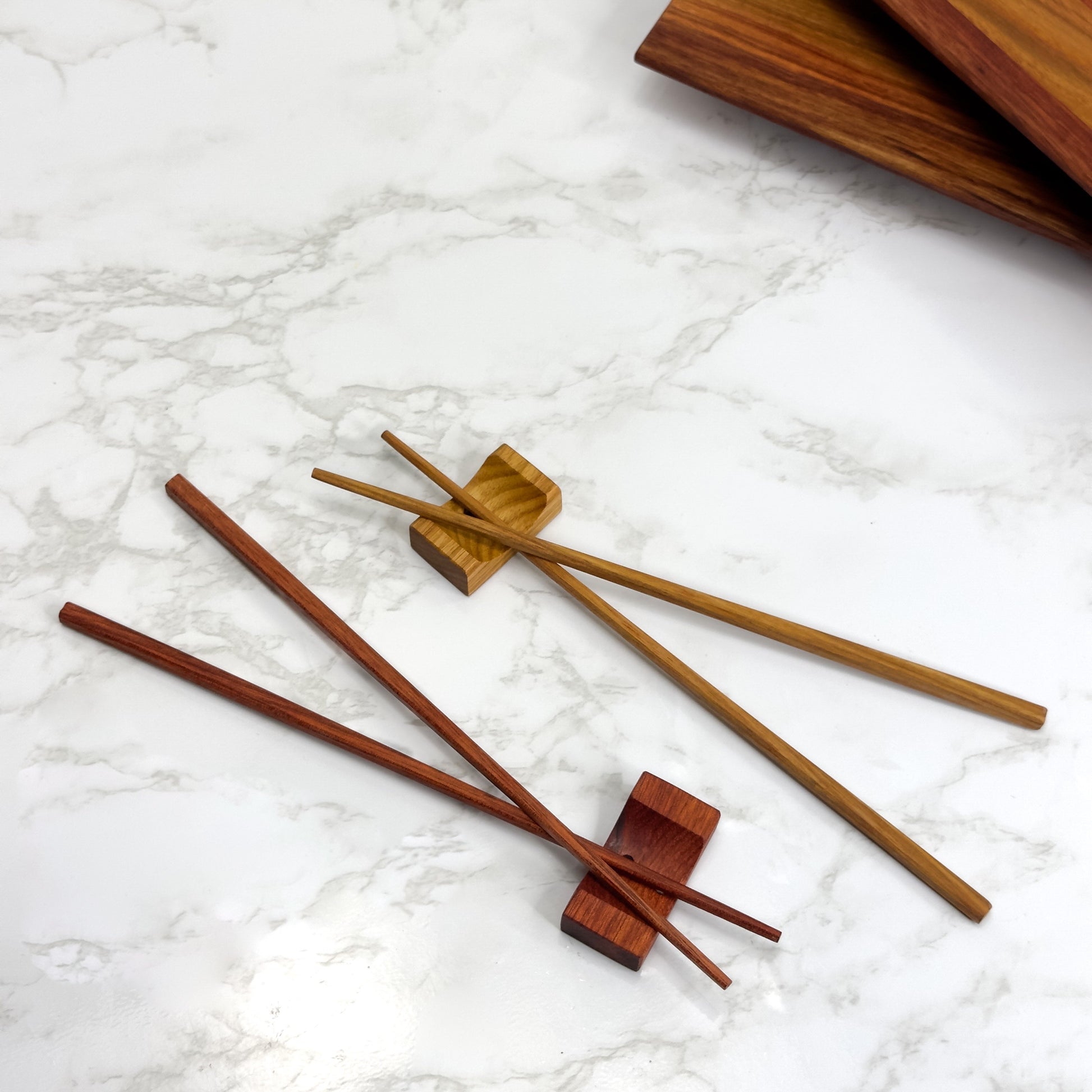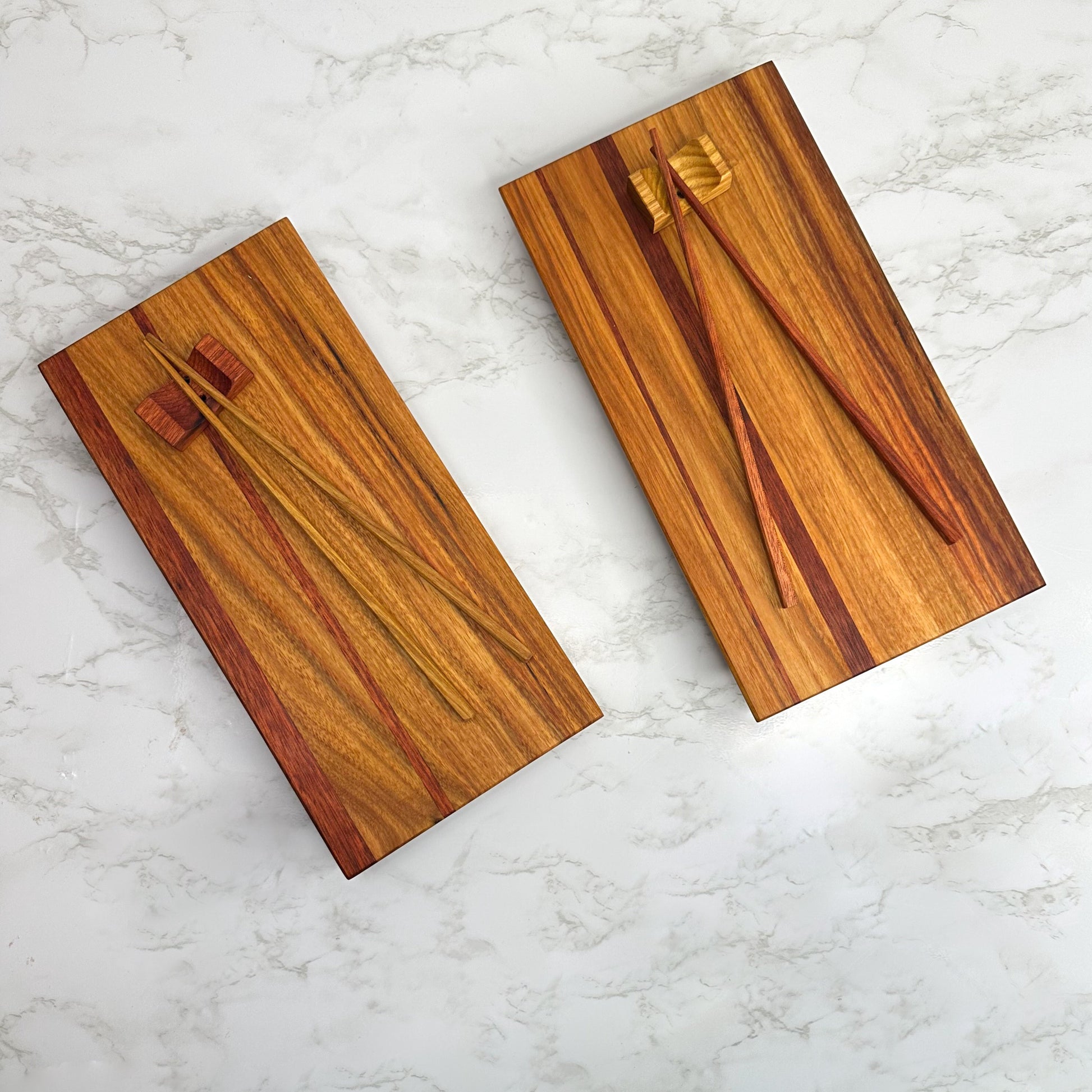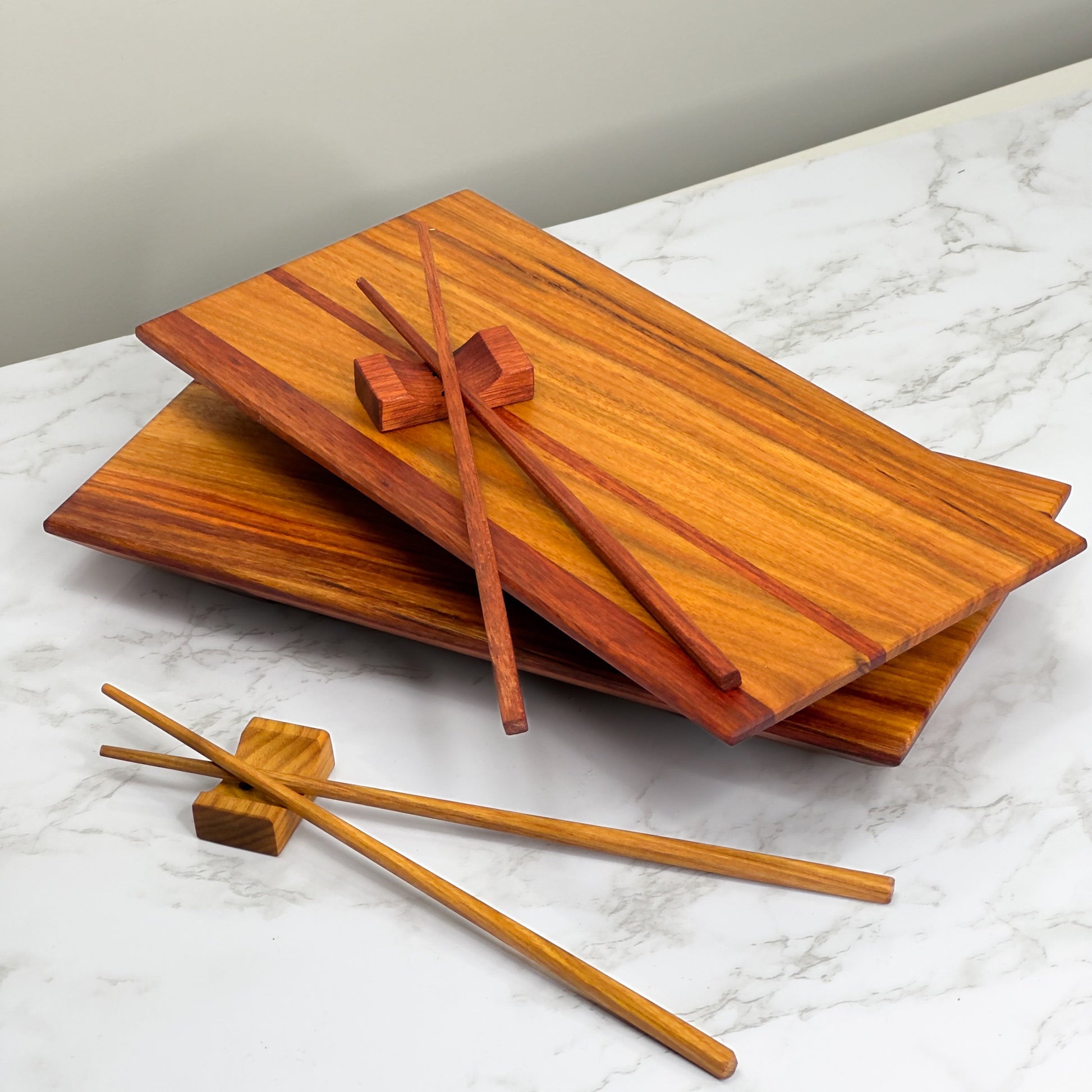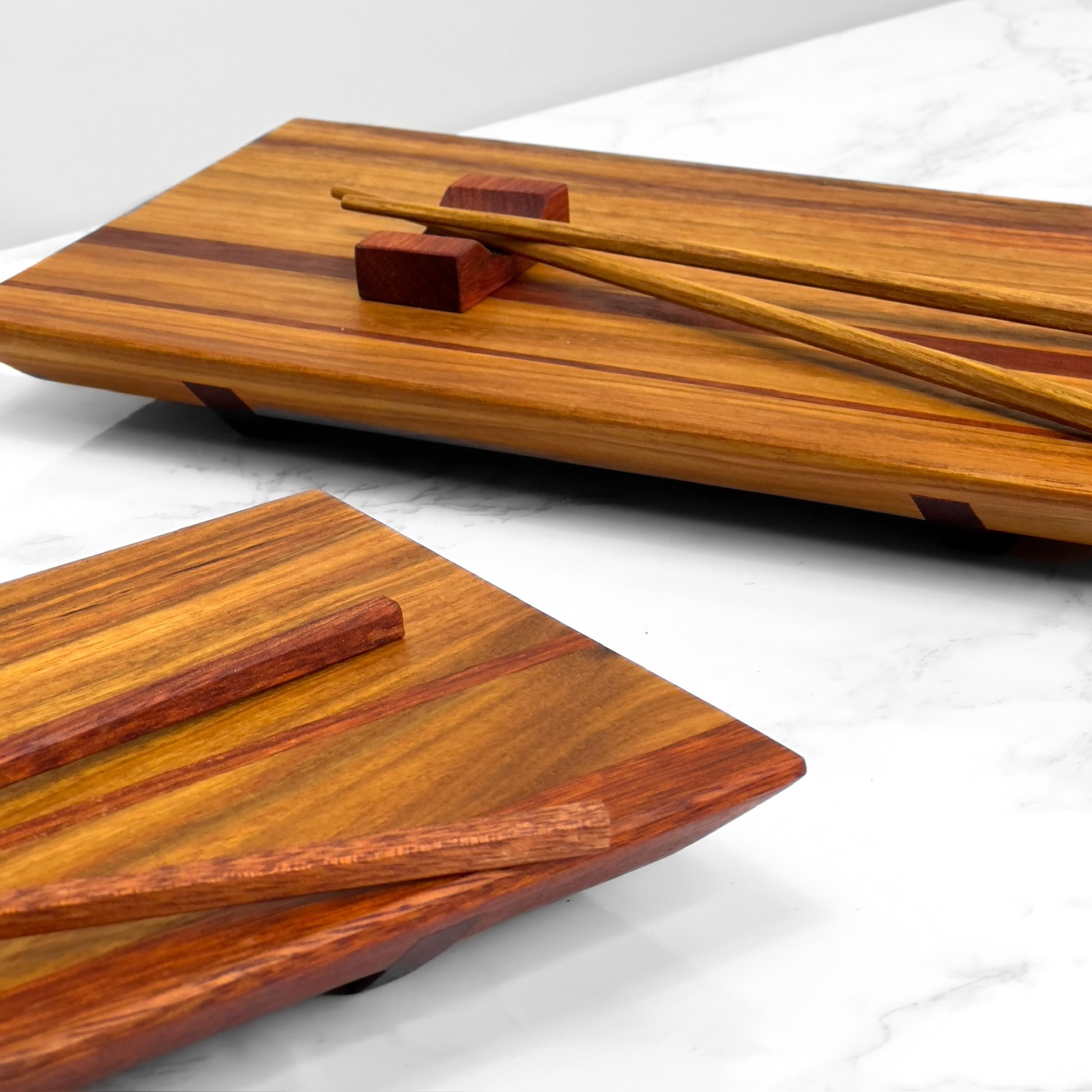 This handcrafted wooden sushi set showcases the beautiful golden effect of Canary wood, accented with vibrant Bloodwood inlays. Smooth edges and soft surfaces make them a pleasure to use.