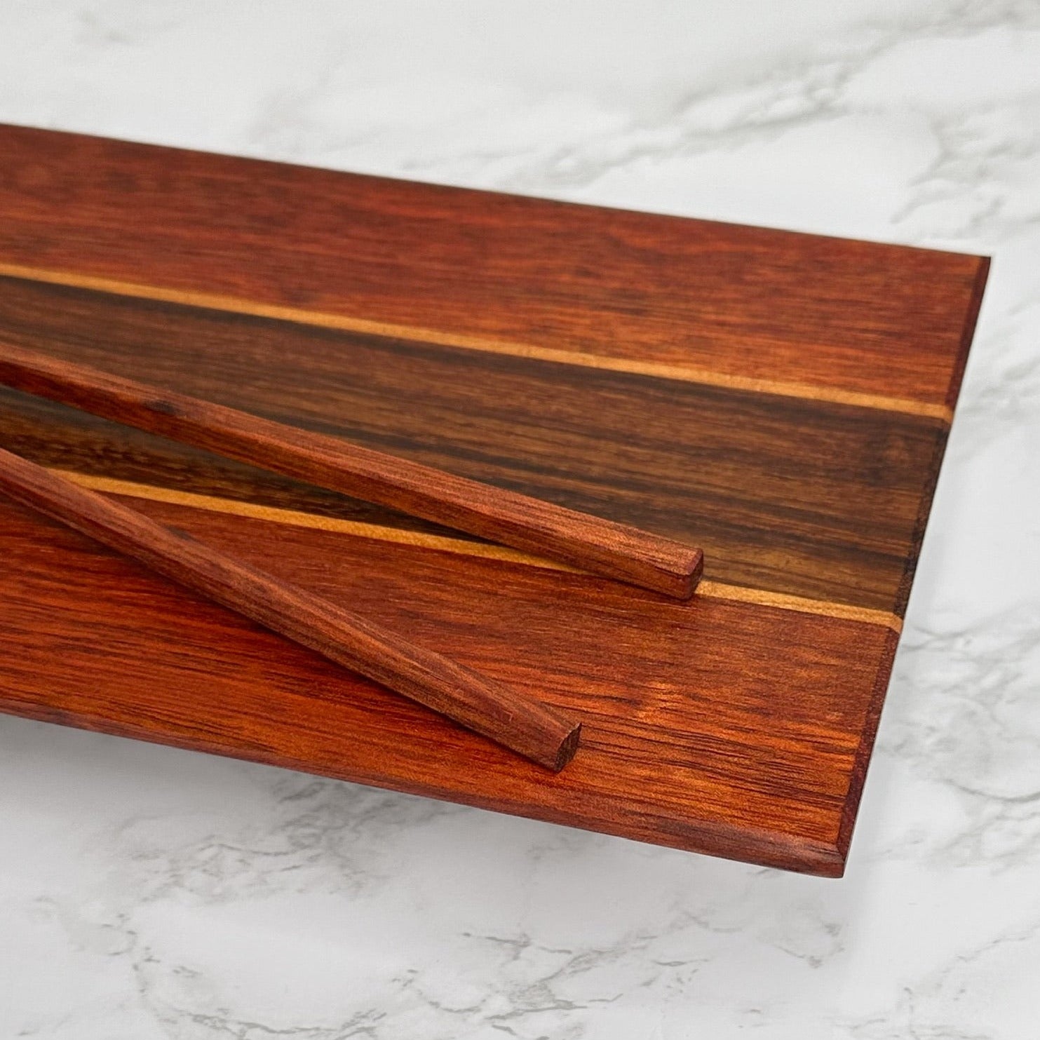 This handcrafted wooden sushi set showcases the vibrant red of Bloodwood, accented with the warm charm of Granadillo, separated with thin cherry inlays. Smooth edges and soft surfaces make them a pleasure to use.