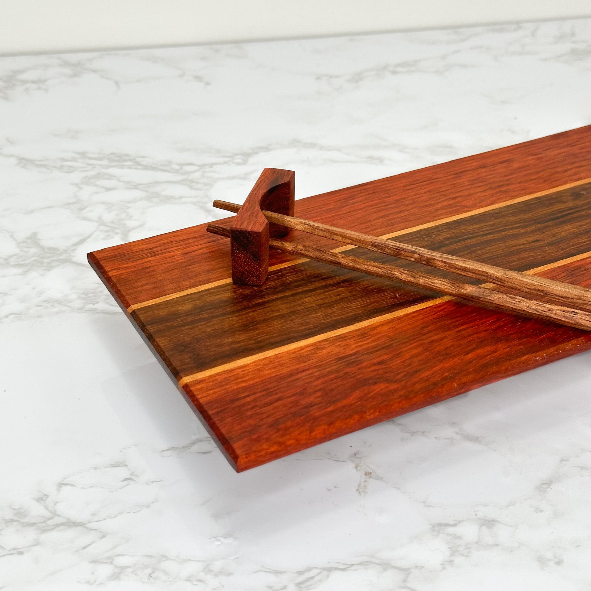 Highlights: Handcrafted from beautiful exotic hardwoods, this sushi set is truly one-of-a-kind. Includes matching chopsticks and chopstick rest