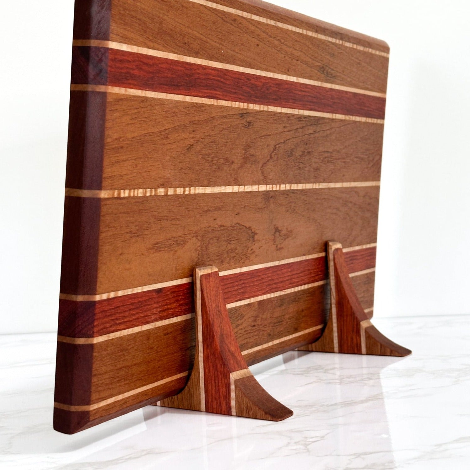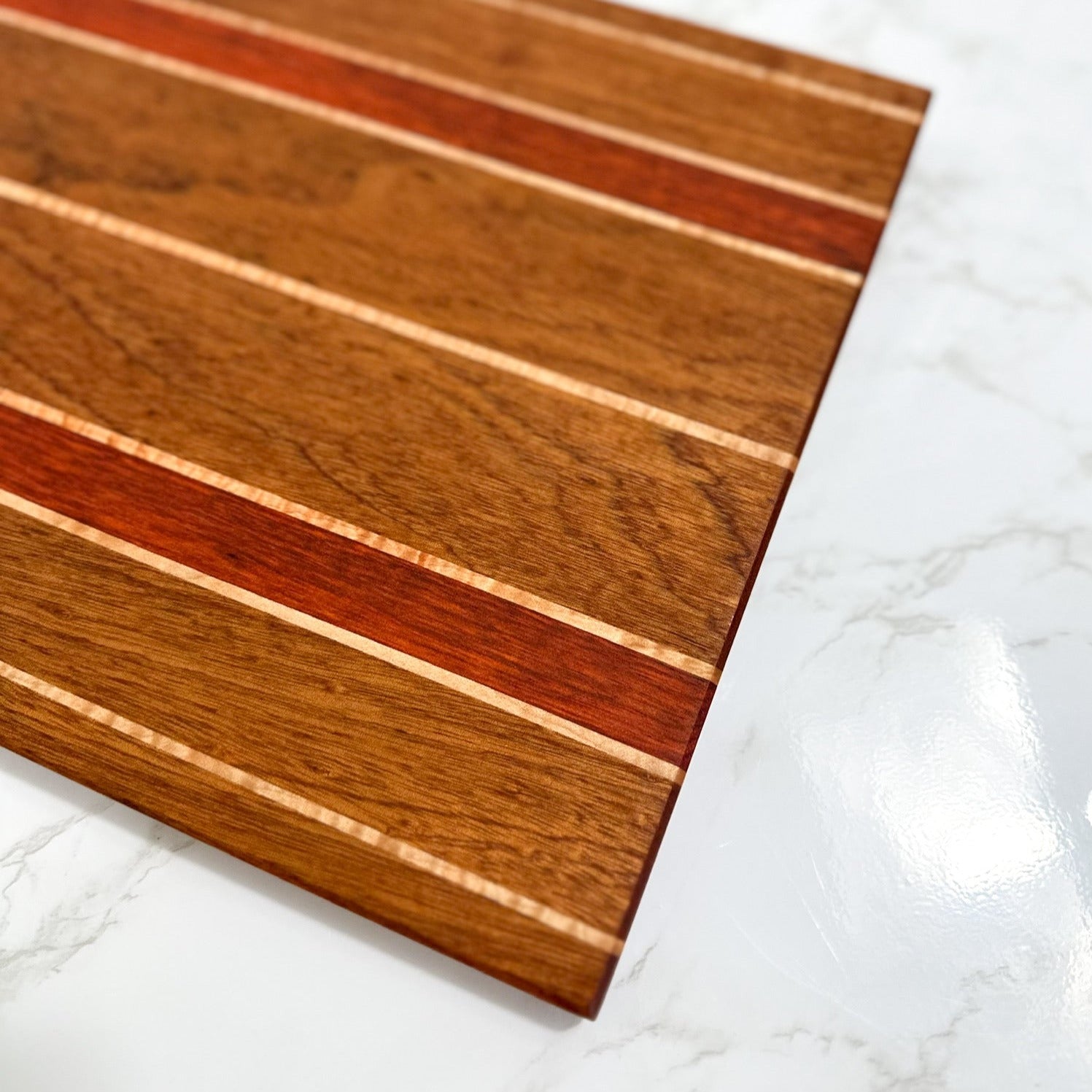 Imagine the satisfaction of slicing and dicing your ingredients on a handcrafted cutting board. The stunning combination of sapele with bloodwood and curtly maple inlays creates a piece that's not only functional but also visually captivating.